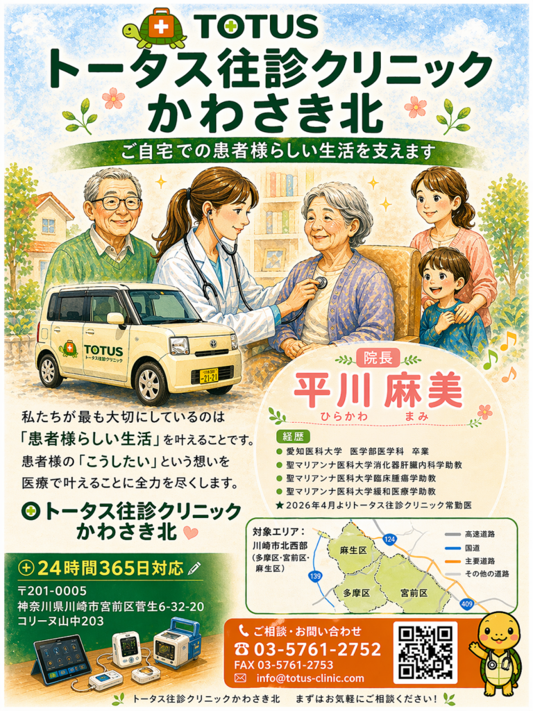 「トータス往診クリニック かわさき北」が今夏、開院予定です。